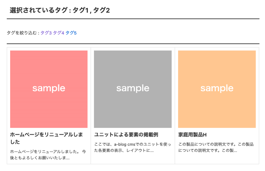 公式テーマにはこのタグの絞り込みの機能が含まれていて、デモサイトでもその動作を確認することができます。下のリンク先ではタグ1とタグ2が両方設定されているエントリーが表示されていて、タグ名のリンクをクリックすることによってタグの指定を増減することができます。
